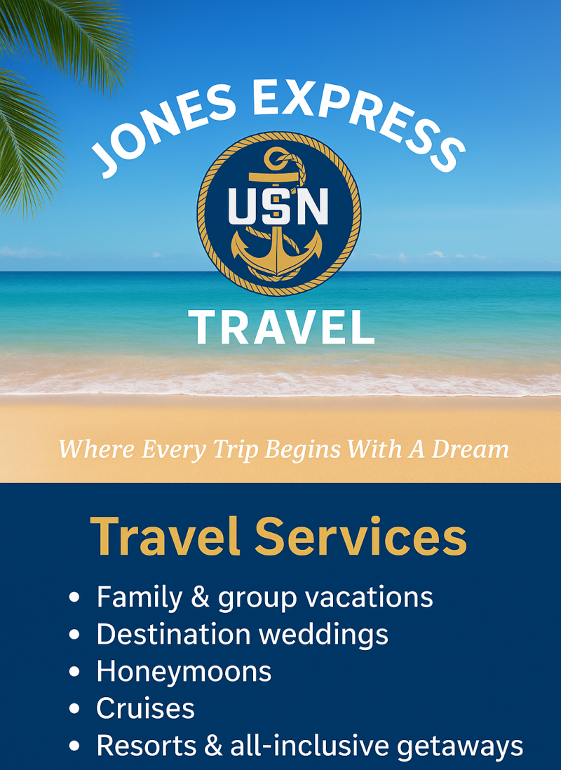 Ready to start your next adventure? At Jones Global Express Travel and Leisure, we're eager to help you plan the perfect trip. As a veteran-owned and operated agency, we bring integrity, precision, and dedicated service to every client. Especially for military personnel, first responders, and their families, we offer exclusive deals and personalized support. Let's make your travel dreams a reality! New clients are welcomed.